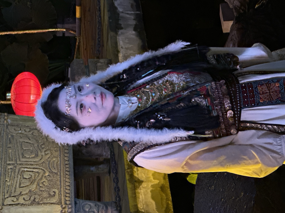 A woman, appearing to be of East Asian descent, is depicted in a full-length, slightly off-center portrait within a dimly lit environment, likely at night, in Yuzhong District, China. She is looking towards the right, her expression neutral. Her face is made up with pale foundation, small gold foil flakes applied to her cheeks and forehead, and a silvery headpiece adorned with a central jewel. She is dressed in elaborate traditional-style clothing, including a white long-sleeved tunic, a dark, ornate vest heavily embellished with layered necklaces featuring coins, beads, and metalwork, and a wide patterned belt with metallic discs. A prominent white fur-trimmed hood or cloak frames her face and drapes over her shoulders. A long white skirt with an embroidered central panel completes her attire. In the background, to the left of the woman, a large, light-colored stone structure with carved motifs is partially visible. Above and behind her, a single spherical red lantern emits a soft glow. The remainder of the background is dark and out of focus, with suggestions of water or a dark surface to the right, and indistinct structures or foliage further back. The scene is illuminated by artificial light sources, casting a yellow-white glow on the woman and foreground elements.