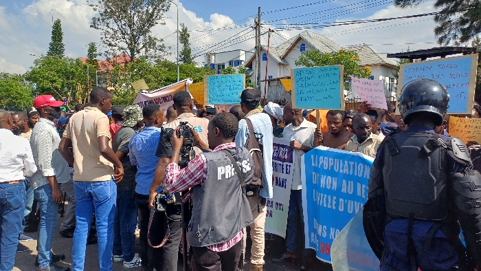 The image depicts an outdoor daytime gathering of approximately 30-40 individuals, primarily adult males, on a street in Kabinzi, Rwanda. The assembly appears to be a public demonstration or protest. Multiple participants are holding aloft light blue rectangular signs featuring handwritten text in an indigenous language. A prominent blue banner in the foreground displays partial text in French, including "LIPOPULATION DI NON AU RE" and "VILLE D'UV." A media representative, identifiable by a grey vest with "PRESS" emblazoned on the back, is visible in the mid-ground operating a video camera. Other individuals are also present with recording devices. In the immediate right foreground, a police officer, observed from the rear, is equipped with dark riot gear, comprising a helmet with a visor, chest and shoulder protection, and a clear riot shield. The environmental backdrop includes multi-story buildings with light-colored exteriors and dark roofs, interspersed with mature trees and overhead utility lines against a sky with scattered clouds.