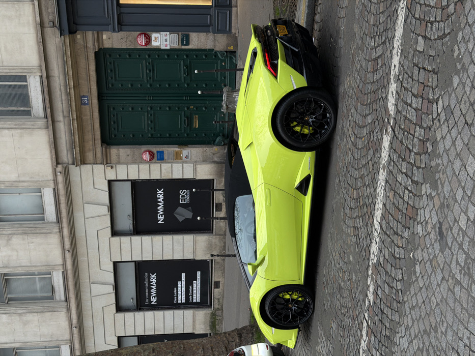 - "A neon yellow Lamborghini Huracan EVO Spyder, with its black soft-top retracted, is parallel parked on a wet cobblestone street at 31 avenue George V in Paris, France" by FM-N1L8J2, licensed under CC BY 4.0
