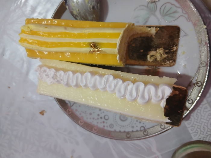 - "Two rectangular cake slices rest on a patterned plate with a silver rim" by FM-0r7343, licensed under CC BY 4.0