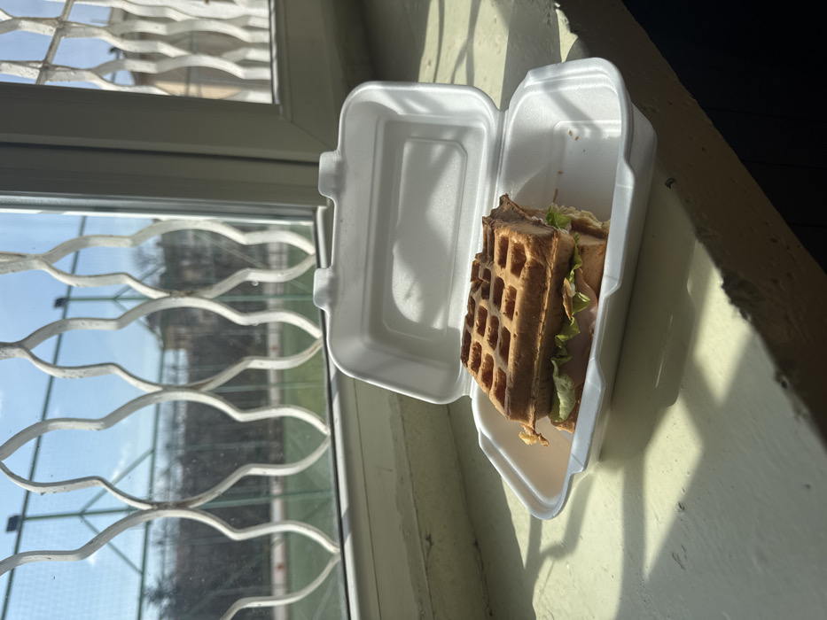 - "A waffle sandwich rests in an open white foam container on a light-colored window sill, illuminated by direct sunlight from the upper right, casting shadows onto the sill" by FM-vZW6U2, licensed under CC BY 4.0