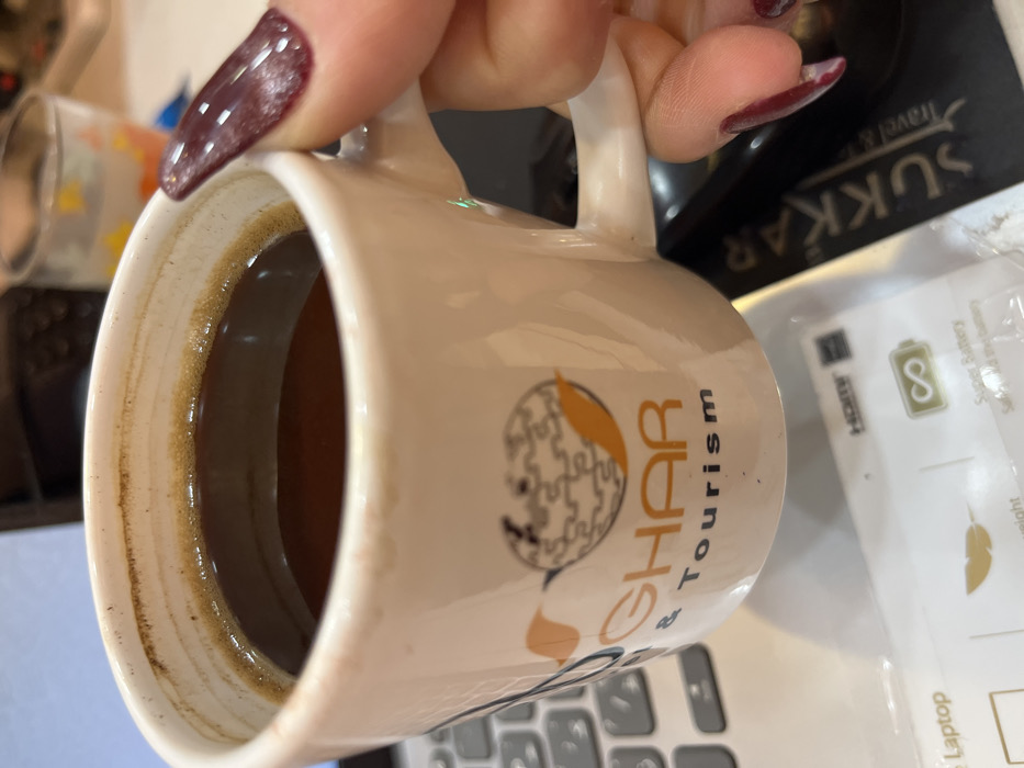 - "A white mug, featuring the "GHAR Tourism" logo with a puzzle piece globe graphic and a yellow wing, is filled with a dark liquid, likely coffee or tea, leaving a stain ring at the top" by FM-PKmM32, licensed under CC BY 4.0