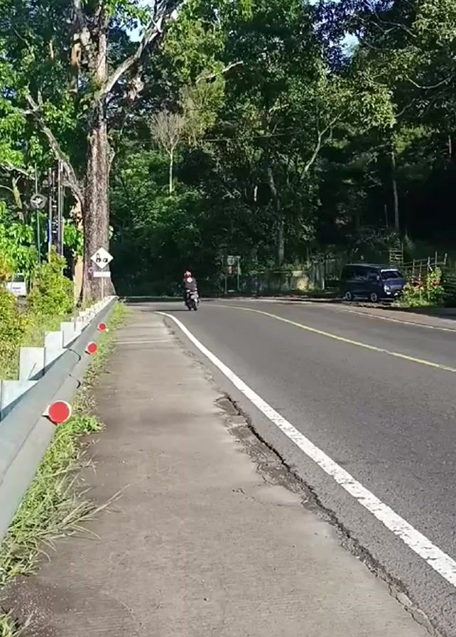 paved road with a sidewalk beside it, flanked by trees and foliage. Two motorcycles pass by on the road, traveling in the same direction, away from the viewer. A parked car is visible on the far side of the road, near the edge of the wooded area.