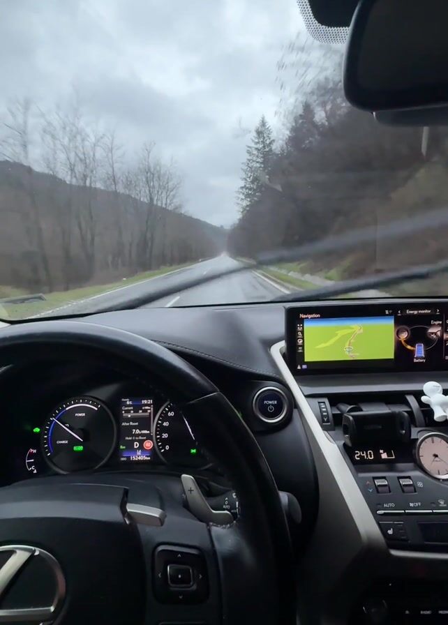 The view from inside a Lexus, focusing on the dashboard and windshield, shows the car driving on a wet, grey day