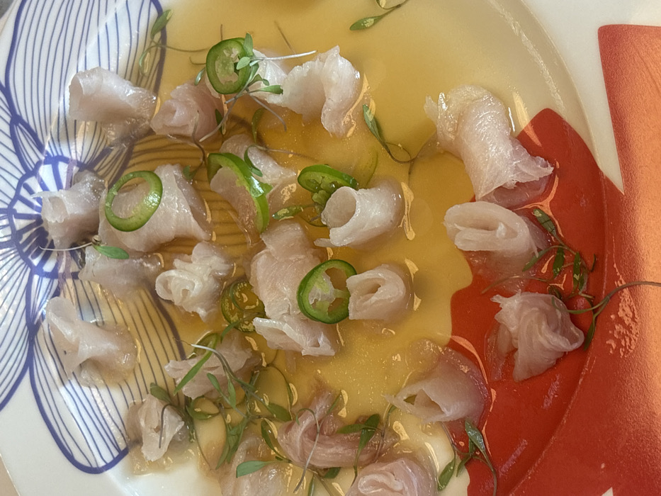 - "The image displays a close-up, overhead view of a plated culinary dish identified as 'tiradito de king kampachi con chile serrano' from Contramar restaurant, located in Mexico City, Mexico" by FM-vhRXA3, licensed under CC BY 4.0