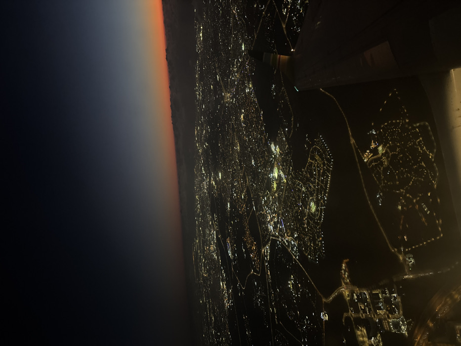 An aerial photograph depicts a sprawling urban landscape within the city of Unknown, Israel, at twilight, observed from an aircraft. The upper sky is a deep indigo, transitioning to a luminous orange-red horizon line punctuated by a thin, illuminated cloud bank. Below, the extensive city is characterized by a dense network of artificial lights that delineate streets, buildings, and various urban structures. These lights form intricate patterns, including linear arrangements of roads, clusters of commercial or residential areas, and distinct illuminated complexes across the dark terrain. In the lower right quadrant of the frame, a segment of a dark aircraft wing is visible, featuring a portion of its engine nacelle and a green striped marking near the fuselage. No individuals, specific subjects, actions, or interactions are discernible.