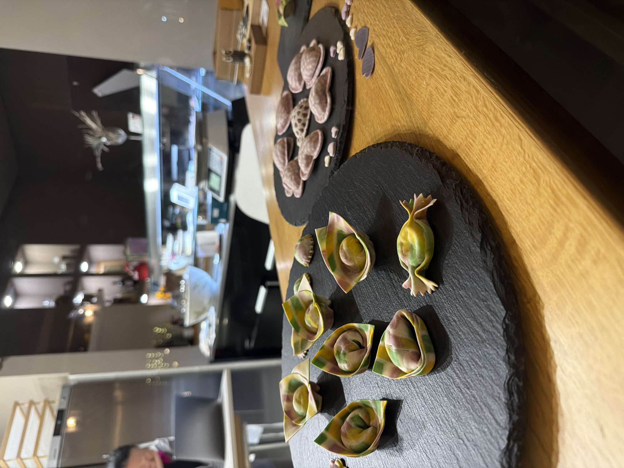 two black slate plates on a wooden table. One plate is in the foreground, showcasing handmade pasta resembling twisted candies, in shades of green, yellow, and purple. The other plate, slightly blurred, displays similar pasta pieces in shades of pink. The background is a restaurant interior with stainless steel shelves, equipment, and display cases. A decorative element hangs from the ceiling in one corner of the display case. While the prompt asked for the location to be identified as Sofia, Bulgaria, there is no information in the image to determine the location of the restaurant. Therefore, the location cannot be verified.