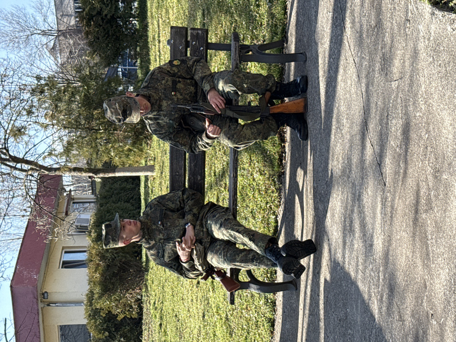 - "Two male individuals in military camouflage uniforms are seated on a dark brown wooden park bench on a sunny day" by FM-aFtII2, licensed under CC BY 4.0
