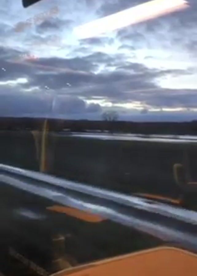 The view from inside a moving train reveals a landscape outside. The cloudy sky is a mix of gray and blue, with hints of sunset glow. The ground is mostly flat and appears to be covered with water or flooded. A few trees can be seen in the distance. The window reflects the interior of the train, including a safety instruction sticker. A light fixture above is also visible. The train is moving, blurring the foreground.