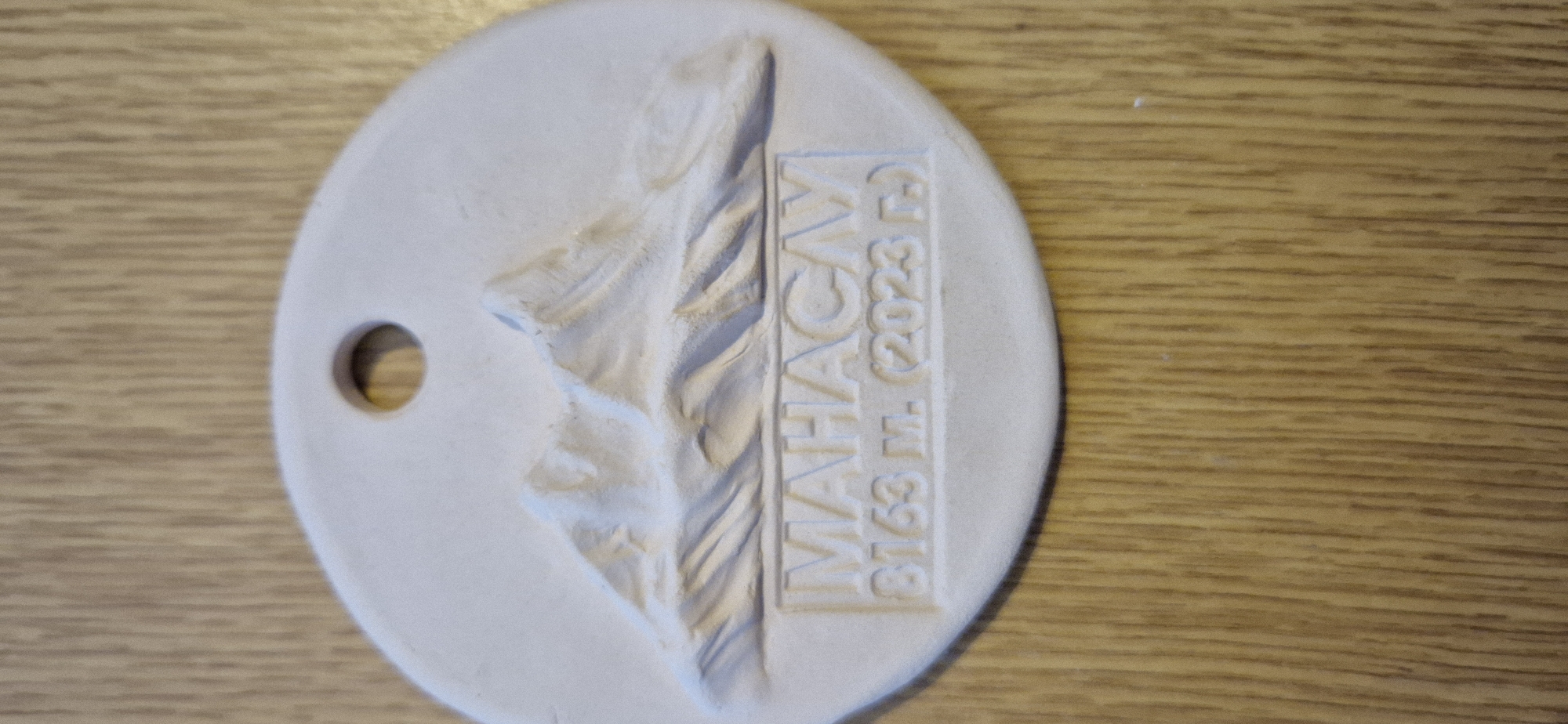 A white, circular medallion rests on a textured light-brown wooden surface in Pernik, Bulgaria. The medallion features a raised relief sculpture of a multi-peaked mountain range in its upper half. Below the mountain relief, embossed text reads "MAHACAV" in Cyrillic script, followed by "8163 m. (2023 г.)" which indicates a height in meters and the year 2023. A small, circular perforation is present at the top center of the medallion. The wooden surface displays vertical grain patterns. No individuals are present. No actions or interactions are depicted.