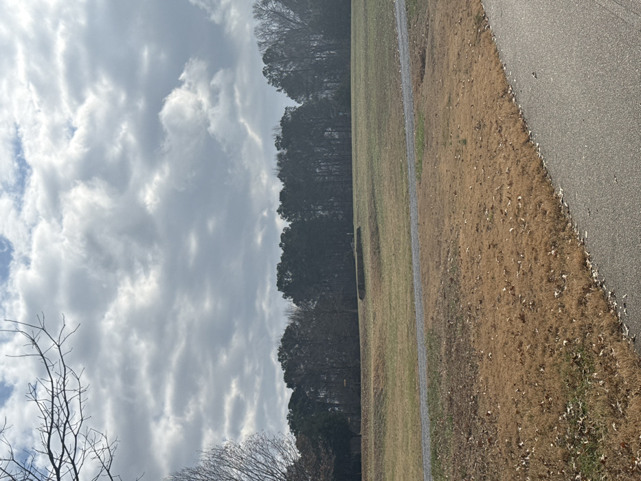 A landscape view under a cloudy sky. A dense tree line separates a grassy field and sky. A narrow path runs parallel to the trees, dividing the field into two distinct areas: green grass closer to the trees and brown grass closer to the pavement. The pavement occupies the right side. Bare branches from nearby trees are visible in the lower left of the image.