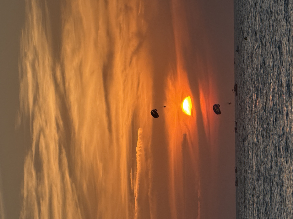 The image displays a sunset scene over the ocean at Cenang Beach, Malaysia. The sky exhibits intense orange, red, and yellow hues, with numerous horizontal, wispy cloud formations. The sun, a bright yellow-orange semicircle, is partially obscured by the horizon line, positioned centrally within the frame. Two individuals are engaged in parasailing; each is suspended beneath a dark, oval-shaped parachute. One parasail and occupant are located above and to the left of the visible sun, while the second parasail and occupant are positioned below the sun. The lower third of the image depicts the ocean, rendered in dark blue-grey tones with visible surface ripples. Multiple boat silhouettes are scattered across the water, with several smaller vessels on the left and a larger, motor-powered boat near the center. A single yellow buoy is present on the far right of the water.