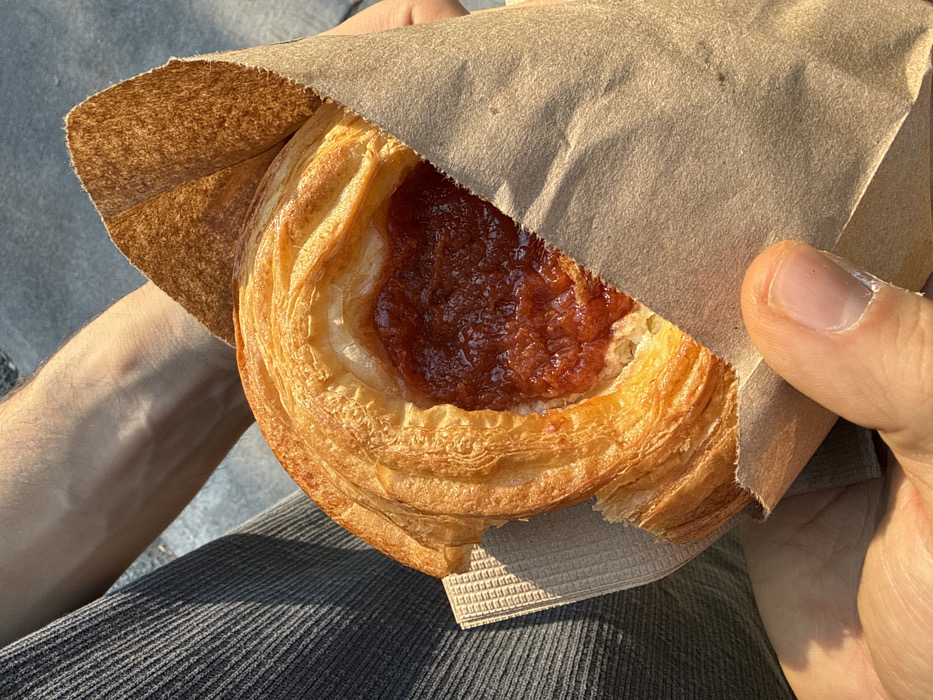 A circular pastry filled with a glistening, reddish-brown jam is held partially within a brown paper bag. The pastry appears golden-brown and flaky. Visible are the arm and hand of the person holding the pastry, along with a portion of their gray corduroy pants. The lighting indicates it is daytime.