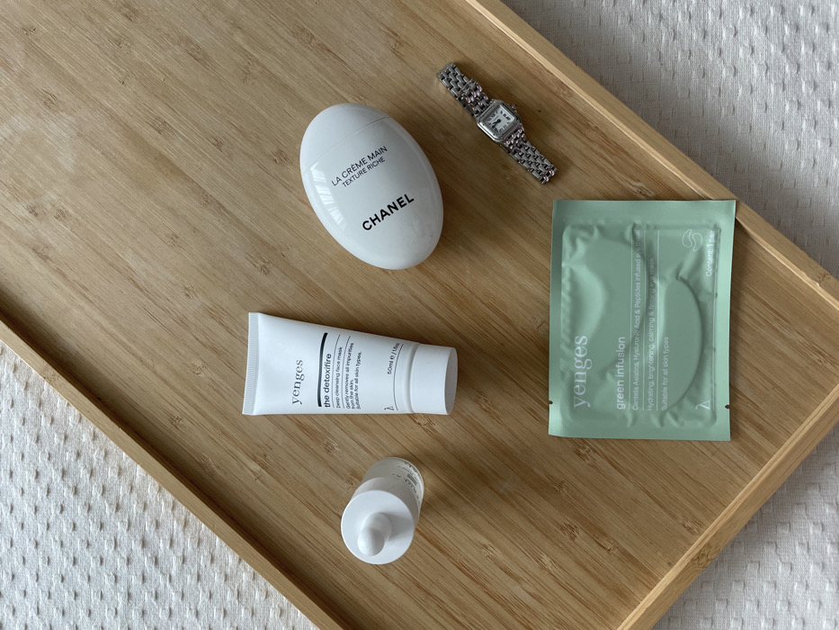 The image displays an overhead view of five personal care items and a wristwatch arranged on a light-brown wooden tray. The tray rests diagonally on a white, textured fabric surface, likely in an indoor setting within Sofia, Bulgaria. From left to right and top to bottom on the tray: 1. A small, clear glass dropper bottle with a white cap, containing a transparent liquid. 2. A white squeeze tube, branded "yenges the detoxifire Deep cleansing face mask", indicating a 50ml volume and suitability for all skin types. 3. A white, ergonomic, egg-shaped container, labeled "CHANEL LA CRÈME MAIN TEXTURE RICHE". 4. A light green foil packet, branded "yenges green infusion Centella Asiatica, Hyaluronic Acid & Peptides infused eye mask", marked as containing 1 pair. 5. A silver-toned wristwatch with a rectangular face and a metal link bracelet, positioned diagonally. All objects are stationary, with no individuals or direct interactions present in the scene. The lighting suggests ambient indoor conditions.