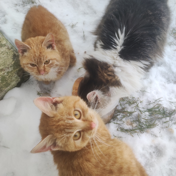 - "The image displays three domestic cats on snow-covered ground in Лунненскі сельскі Савет, Belarus" by FM-TzA0d2, licensed under CC BY 4.0