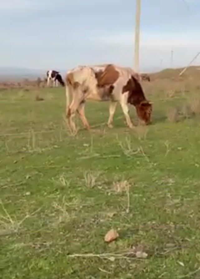 The video depicts a rural scene with a cow grazing in a grassy field
