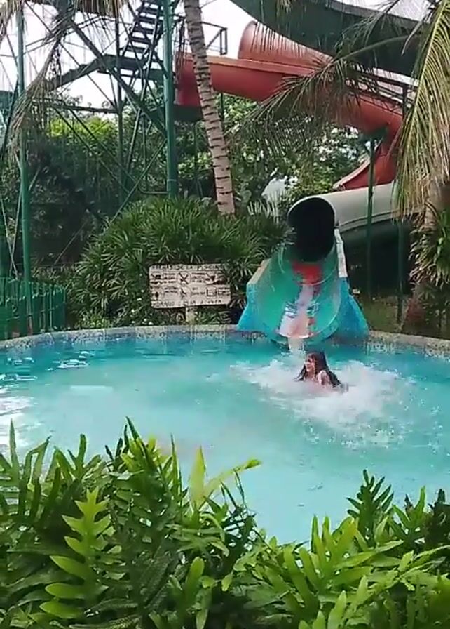 A low-angle, eye-level shot of a water park shows a girl falling into a pool at the base of a water slide