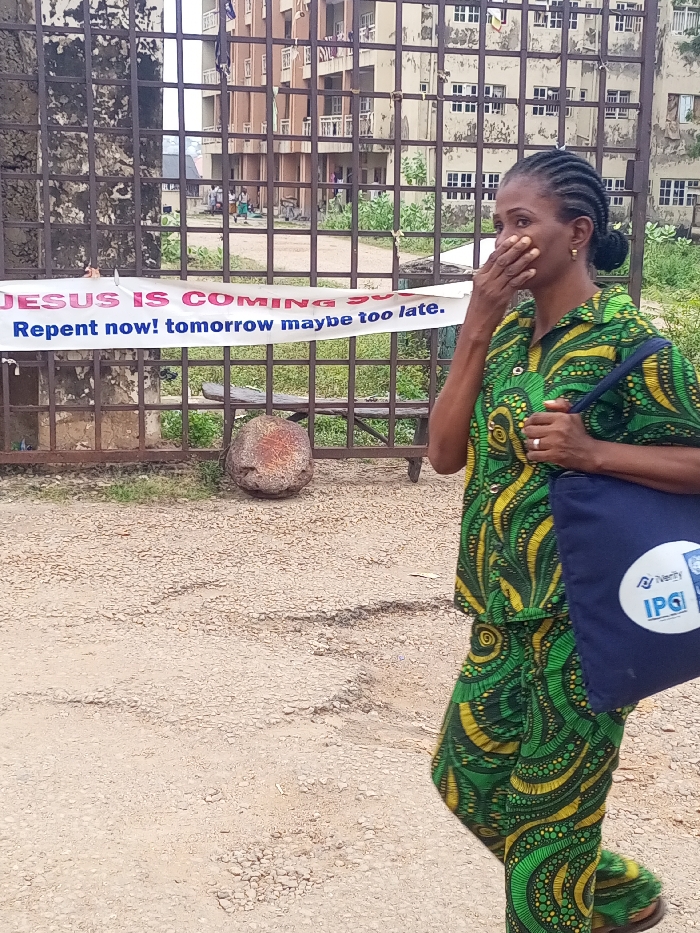 An adult female, of apparent African descent, walks from right to left in Adankolo, Nigeria, on an unpaved road. She is dressed in a two-piece outfit with a vibrant green and yellow swirl pattern. Her dark hair is styled in braids, and she wears a gold-colored earring and a ring on her left ring finger. Her right hand is positioned over her mouth. She carries a dark blue tote bag over her left shoulder, bearing a white circular logo featuring "Verity" and "IPG". Behind her, spanning the midground, is a dark-colored, grid-patterned metal gate. A white banner is affixed to this gate, displaying "JESUS IS COMING" in red text above "Repent now! tomorrow maybe too late." in blue text. An irregular, brownish-red, rocky object rests on the gravel ground directly behind the gate, beneath the banner. In the background, visible through and beyond the gate, are multiple multi-story buildings, light brown in color with numerous rectangular windows, suggesting residential or institutional architecture. Faint, indistinct human figures are discernible in the distance between the gate and these buildings. Green vegetation is visible on both sides of the distant structures. The ground surface is composed of light-colored gravel and dirt. The scene is illuminated by natural daylight.