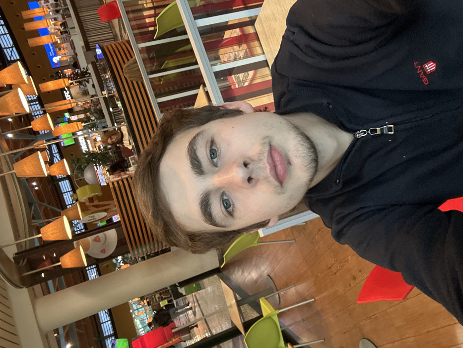 A young man with light skin, brown hair, and a trimmed beard wears a dark zip-up jacket with a visible Gant logo