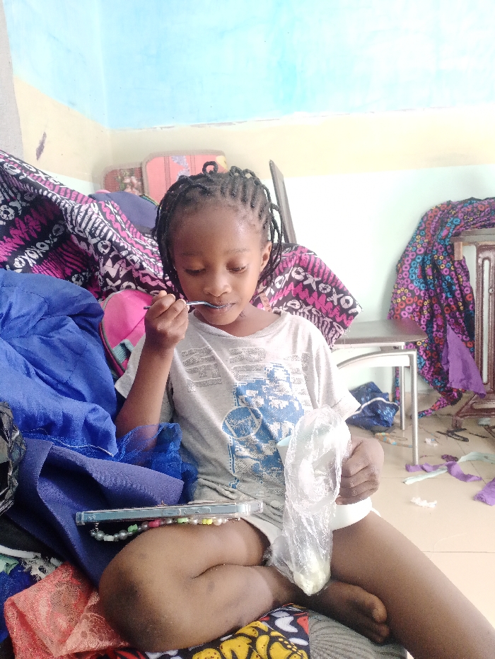 An indoor scene in Rido, Nigeria, depicts a young Black girl with braided hair, estimated to be between 5-10 years old, seated cross-legged. She is eating a light-colored, possibly viscous, substance from a clear plastic bag using a small silver spoon. The girl wears a grey t-shirt with a blue graphic design and light-colored shorts. A smartphone in a clear case, adorned with a multi-colored beaded bracelet, rests on her right thigh. The background is cluttered with various patterned fabrics, including dark blue and a pink/purple geometric print, draped over what appear to be stacked items or furniture. A metal-framed table or chair is visible to the right. The room's walls are painted in horizontal sections of light blue (upper), pale yellow (middle), and pale green (lower right). Fabric scraps are scattered on the floor to the right.