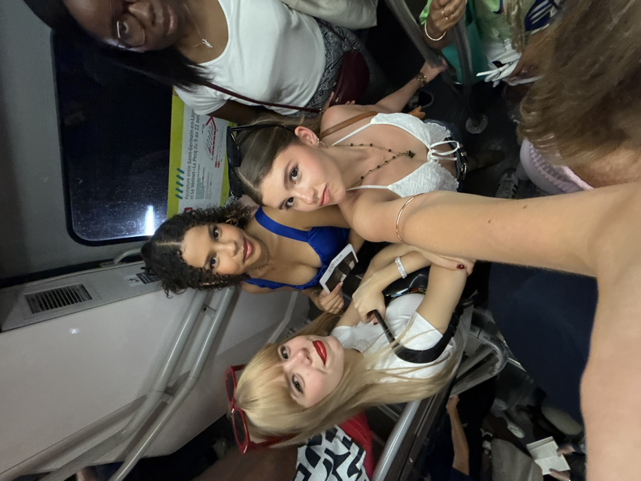 Four young women pose for a selfie on what appears to be public transportation. One woman wears a blue top and has curly hair. Another wears a white top and dark necklace, with her hair pulled back. A third is wearing a white shirt with red lipstick and red sunglasses perched on her blonde hair. The fourth woman in the back is wearing a white t-shirt and glasses. A window and a transit schedule can be seen in the background.