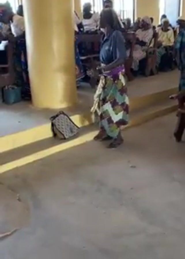The video showcases a church ceremony. The scene begins with a woman in a colorful patterned skirt standing and listening in a hall filled with seated individuals. The camera then shifts to capture the entrance of a bride, radiant in a shimmering white gown, accompanied by a man in a white tuxedo. They stand near rows of pews occupied by guests. The environment appears to be a church interior, decorated with hanging red and gold curtains.