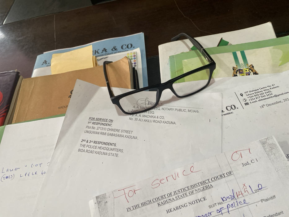 An overhead, slightly oblique photograph depicts a static scene of legal or official documents and a pair of eyeglasses arranged on a dark, polished surface. The documents are primarily in English and consistently reference "Kaduna State of Nigeria" and specific addresses within Kaduna, Nigeria. Visible text includes "FOR SERVICE ON 1ST RESPONDENT, Plot No. 271310 OHIKEKE STREET, UNGUWAN RIMI GABASAWA KADUNA" and "2ND & 3RD RESPONDENTS, THE POLICE HEADQUARTERS, BIDA ROAD KADUNA STATE". Another prominent document, a "HEARING NOTICE" from "THE HIGH COURT OF JUSTICE/DISTRICT COURT OF NIGERIA, KADUNA STATE OF NIGERIA," is partially visible with "FOR Service" handwritten in red ink. A letterhead for "A. A. MACHIKA & CO." displays "No. 35 ALI AKILU ROAD KADUNA" and a date of "18th December, 202X". A handwritten legal citation, "Lawan v COP (2003) LPEPLR 60", is also visible. A pair of black-framed prescription eyeglasses with clear lenses lies on top of the stack of papers. The environment is an indoor setting, likely an office or legal workspace, in Kaduna, Nigeria. No individuals, actions, or interactions are depicted.