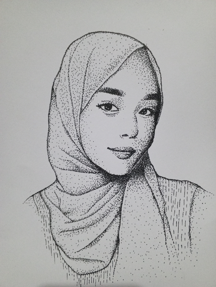 This image is a black and white stippling portrait rendered on a light-colored surface, depicting a young woman from the chest up against a plain, undifferentiated background. The scene, therefore, lacks discernible external geographical features or objects, with the broader context of its location identified as Unknown, Unknown. The subject is a young woman, likely East Asian or Southeast Asian, facing slightly right but looking directly forward. Her head is tilted subtly. She wears a hijab, a headscarf that covers her hair and drapes over her shoulders and upper chest, with visible folds and contours rendered through varying densities of dots. Beneath the hijab, a garment with vertical striped detailing is visible on her shoulders and upper chest area. Her facial features include dark, well-defined eyebrows, large eyes with visible irises and pupils, a small nose, and full lips curved into a subtle, gentle smile. Shading on her face, particularly beneath the chin, along the jawline, and around the eyes and nose, is achieved through stippling, creating depth and form. No other people, subjects, objects, or actions are depicted beyond the portrait itself. The environment is a neutral, blank background.