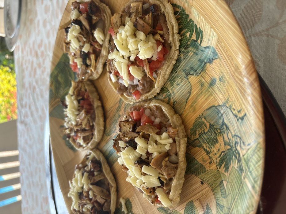 - "Five tostadas are arranged on a decorative wooden platter with a pattern of green and yellow leaves" by FM-TOclH2, licensed under CC BY 4.0