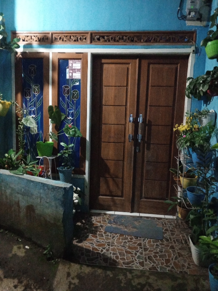 The image displays the brightly illuminated exterior entrance of a residential building at night in Catarman, Philippines. The building facade is painted sky-blue. A central brown wooden double door, featuring horizontal paneling and two sets of polished silver-colored handles, is present. To the left of the door are two narrow windows, each with a stained-glass-like design depicting blue and green tulips. A carved wooden transom panel spans above the door and windows. High on the wall to the right of the door, an electric meter box is mounted. The entryway floor consists of brown, tan, and dark-brown mosaic-patterned tiles, with a dark doormat featuring a lighter abstract design positioned in front of the door. Numerous potted plants are arranged around the entrance; on the left, behind a low, light-blue painted concrete wall, and on the right, utilizing a white metal tiered plant stand and hanging planters on the wall. The ground beyond the tiled area appears dark and moist. No individuals are visible in the scene.