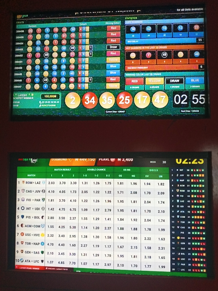 Two digital display screens are vertically mounted against a dark reddish-brown wall in a commercial establishment in the city of Sardauna, Nigeria. The upper screen presents a digital lottery or keno-style game interface, featuring a historical result grid on the left, current winning numbers (2, 34, 35, 25, 17, 47) prominently in the lower center, and a countdown timer displaying "02 55" minutes and seconds on the lower right. Statistical data, including "LATE NUMBERS" and "HOT NUMBERS IN THE LAST 20 DRAWS", is visible on the right side. A "LATEST JACKPOT WINNER" displays "100,000 N". The lower screen displays sports betting odds, specifically for football matches, under the header "DIAMOND N 449,150 PEARL N 3,400" and a timer showing "02:23". It features a table with "MATCH", "MATCH RESULT" odds (1, X, 2), "DOUBLE CHANCE" odds, "GG NG" options, and "O/U 2.5" (Over/Under 2.5 goals) odds for various teams like "ROM v LAZ" and "CAG v JUV". A column on the right details team performance histories using colored indicators. No individuals or active interactions are depicted.