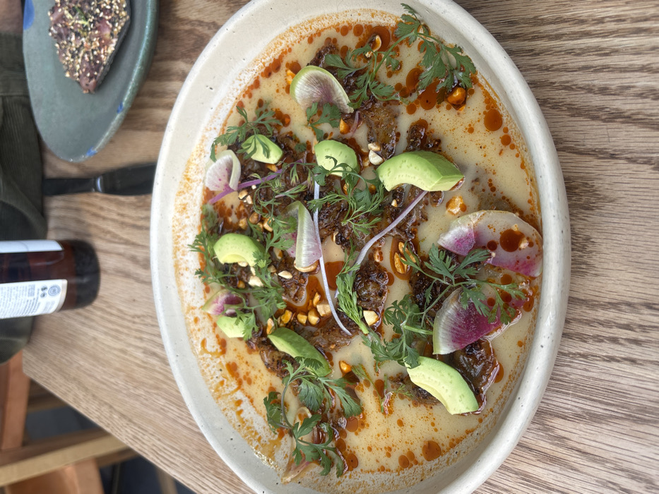 A white plate holds a vibrant dish. The base appears to be a creamy sauce dotted with reddish-brown oil. Scattered throughout are dark, meaty pieces, along with slices of avocado and radish. The dish is garnished with small sprigs of fresh green herbs and chopped nuts. A small green plate containing a piece of seared tuna rests beside the main dish. A bottle and a knife are also partially visible.