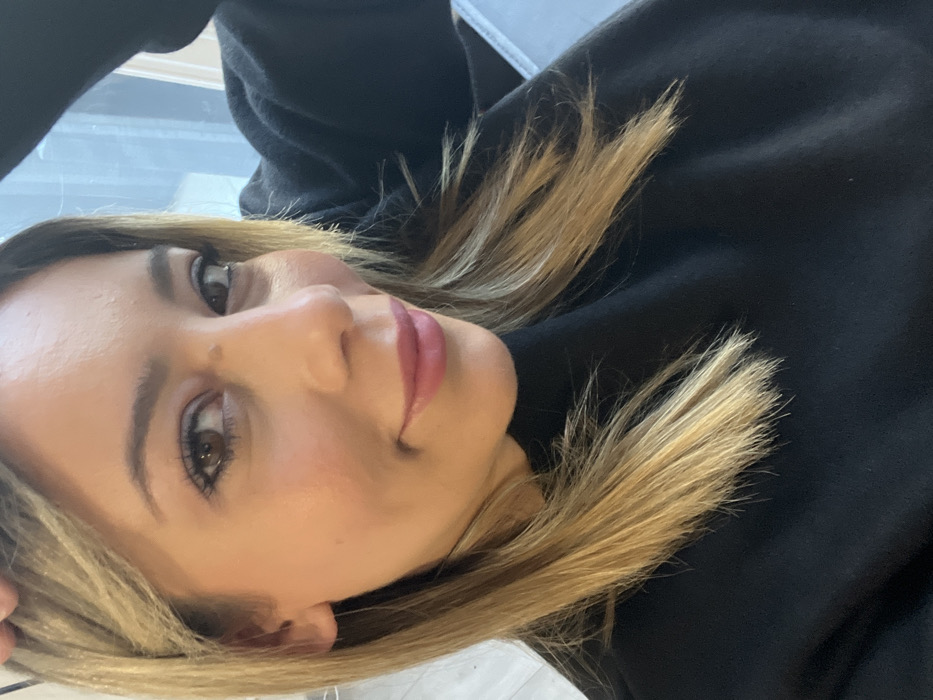 The image displays a headshot of a female subject, approximately 20-40 years old, with light skin tone and shoulder-length blonde hair with darker roots, parted on her left