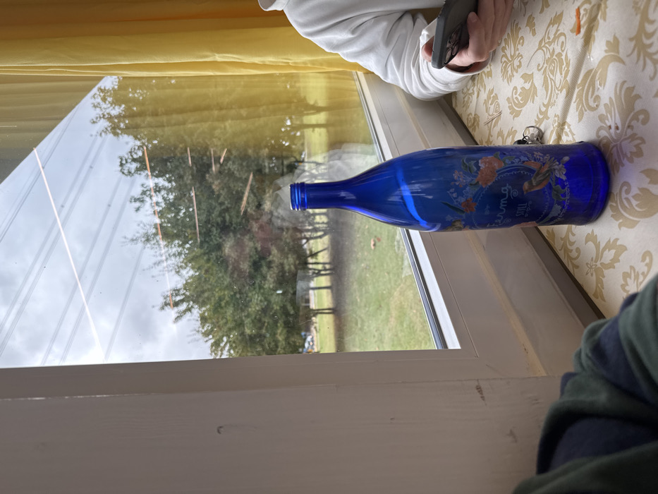 The image depicts an indoor scene in Anzola dell'Emilia, Italy, looking outwards through a window on an overcast day. **Indoor Environment:** A white window frame occupies the left and bottom portions of the view. On the right, a yellow curtain is visible. A surface, likely a table or wide window sill, covered with a gold and white patterned cloth, extends across the lower part of the frame. * **Objects:** A tall, slender, dark blue glass bottle with a decorative label featuring floral and bird motifs and the text "Firma STILL" is centrally positioned on the patterned surface. To the right of the bottle, a set of keys with a black fob is present. * **People:** On the right side, the right arm and hands of an individual wearing a white long-sleeved garment are visible, holding a dark-colored smartphone. On the far left, a partial view of a second individual's left arm and shoulder, dressed in a dark green and blue garment, is seen. **Outdoor Environment (Viewed through Window):** The window reveals an outdoor area under a light grey, overcast sky. * **Landscape:** A green, grassy area extends from the base of the window into the mid-ground. Beyond the grass, a cluster of deciduous trees with green foliage forms a dense line. * **Infrastructure:** Faint horizontal lines, consistent with overhead power lines, are visible across the sky and through the upper parts of the tree line. In the distance behind the trees, vague outlines suggestive of a road or distant structures are discernible.