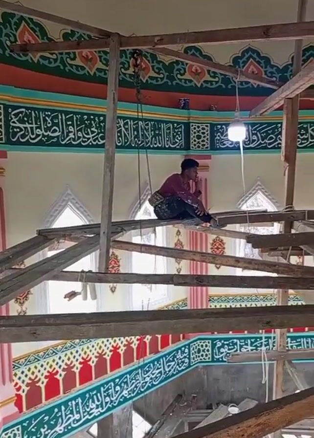 interior of a building, possibly a mosque, under renovation. A man is seen sitting on a complex wooden scaffolding structure built inside. The scaffolding is made of crisscrossing beams and support posts. The interior of the building is decorated with intricate painted patterns and Arabic calligraphy on the walls and ceiling. The light is provided by a single bulb hanging above the structure. The overall view shows the renovation process from a low angle, focusing on the scaffolding and the decorations.