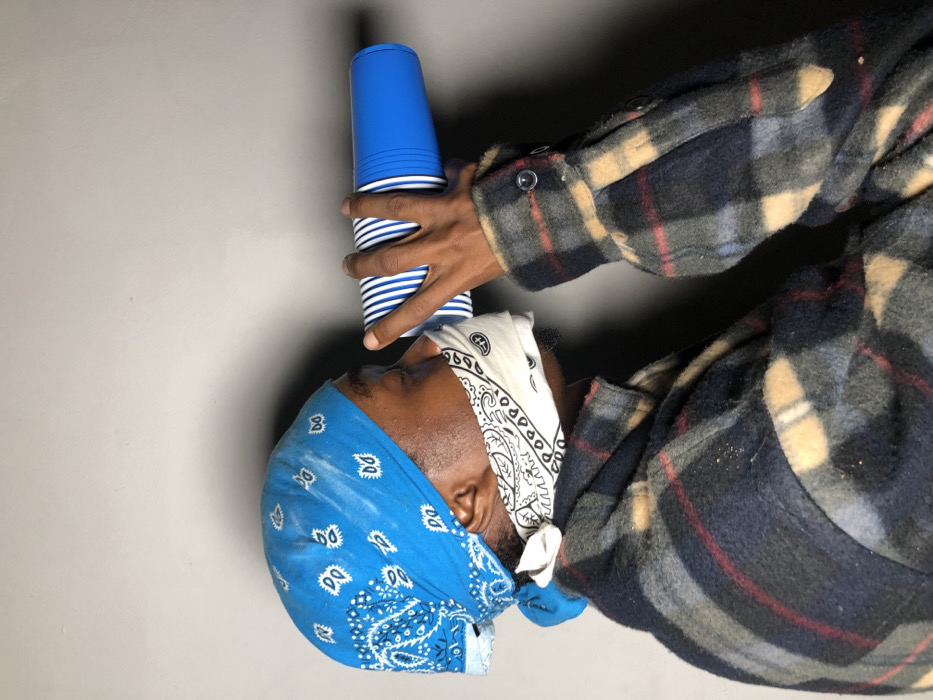 A person wearing a blue paisley bandana and a white bandana around their head lies on a gray surface. Their right hand holds a stack of blue and white striped plastic cups balanced on their forehead. They wear a plaid jacket with visible buttons. The image is oriented sideways.