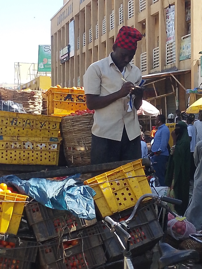 The scene depicts an outdoor market in Sabon Gari West, Nigeria