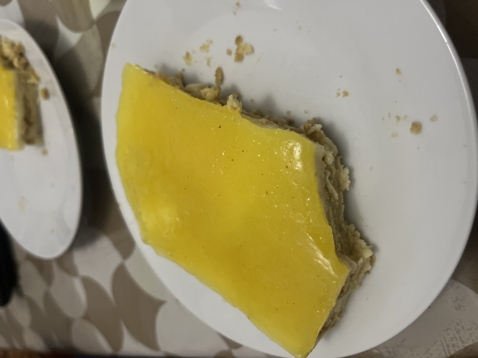 This scene is situated in Ksar-el-Kebir, Morocco. The image displays two partially consumed dessert slices on white circular plates, positioned on a geometrically patterned table surface. In the foreground, a rectangular slice of dessert, approximately 10x6 cm, is centered on a white plate. This dessert features a bright yellow, translucent, slightly textured top layer, suggestive of lemon curd or glaze. Beneath this, a layered or crumbly light-beige base is visible, consistent with a shortbread or biscuit crust. A noticeable bite has been taken from the left side of the dessert, exposing the internal structure. Several small, light-colored crumbs are scattered on the white plate surface surrounding the main dessert. In the blurred background, a second white plate holds another similar, partially eaten dessert slice. The table underneath exhibits a repeating pattern of light brown and off-white interlocking shapes. No individuals are visible.