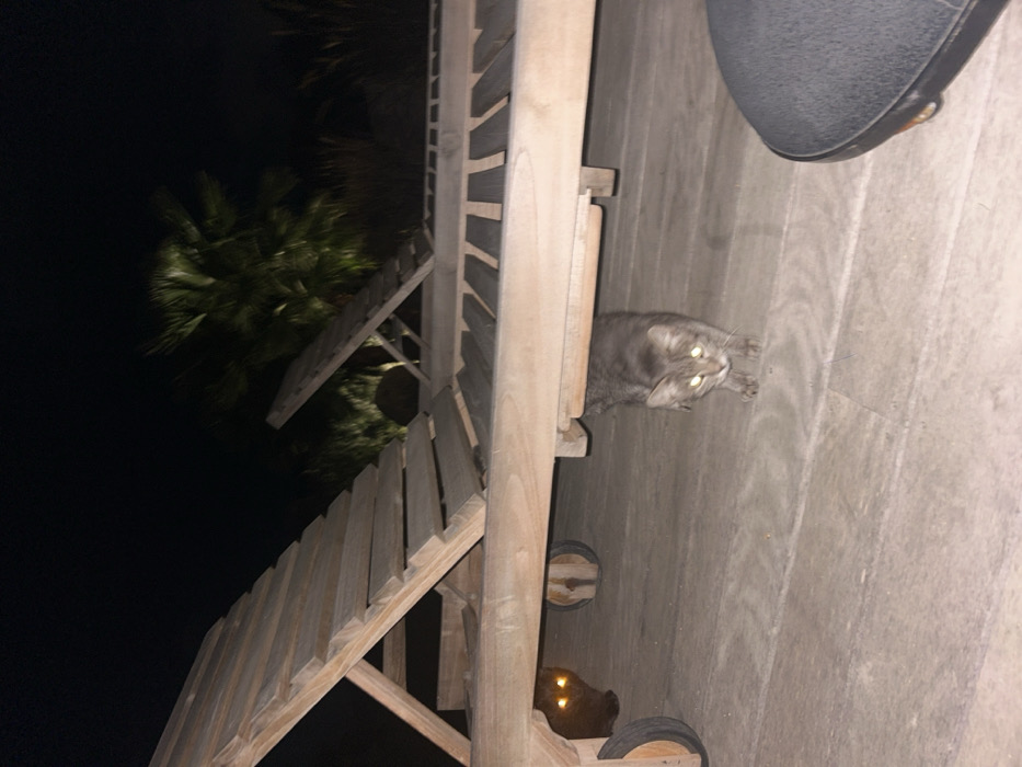 - "This nocturnal image depicts an outdoor scene in Zonza, France, featuring two cats under a wooden lounge chair on a tiled or paved surface" by FM-M0WFF2, licensed under CC BY 4.0