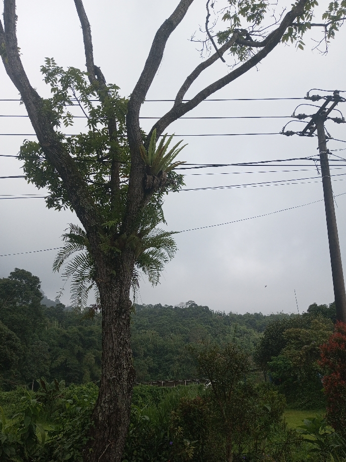 A tree with a thick, textured trunk dominates the foreground, adorned with various plants growing on its branches. Utility poles and wires stretch across the overcast sky in the background. Rolling green hills are visible further in the distance, covered in lush vegetation. The overall scene depicts a rural landscape on a cloudy day.