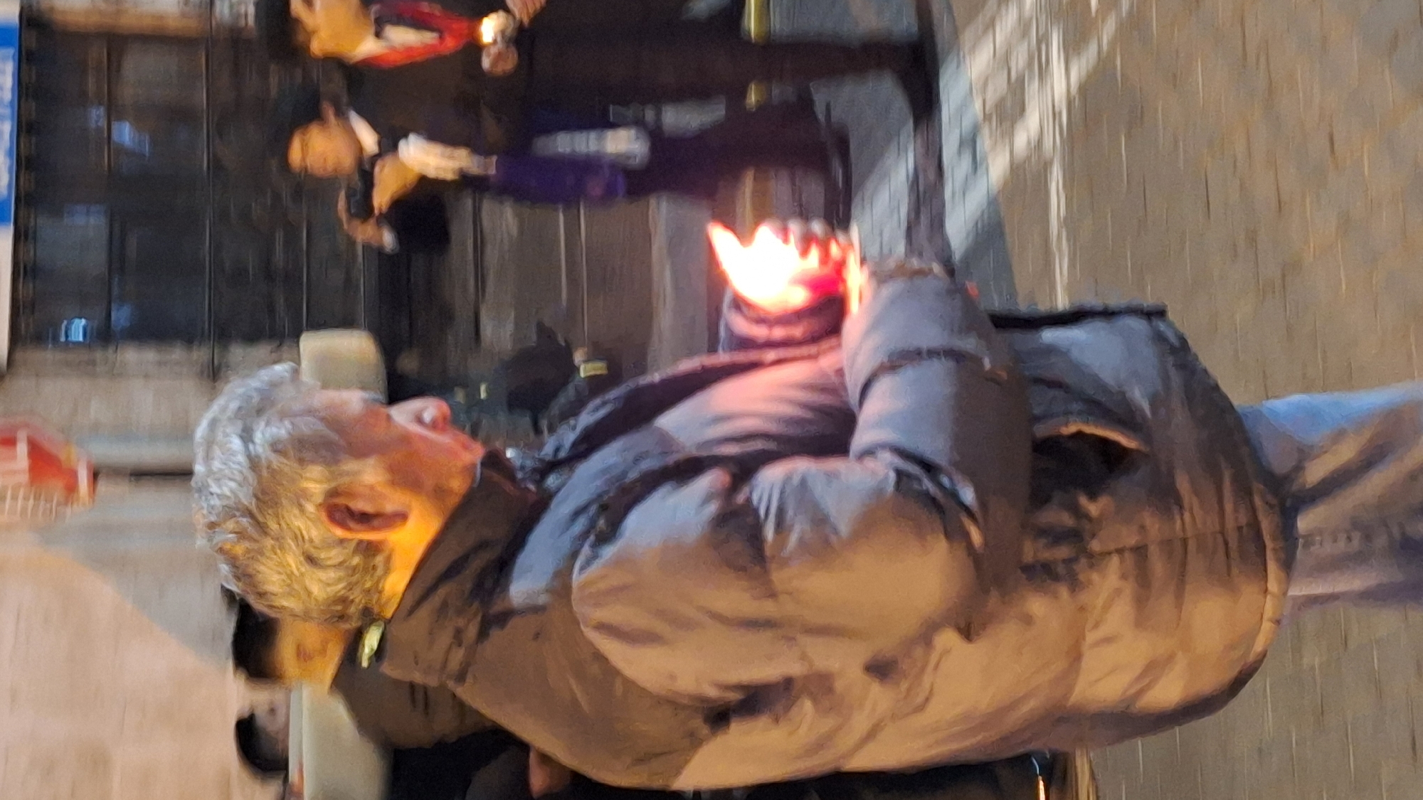 A medium shot depicts an individual holding a lit candle. They are outside, in a city possibly located in Arequipa, Peru. The subject wears a puffy winter coat. The background contains brick structures, pedestrians, and other buildings, indicating an urban environment. The person holds a candle upwards and looks to the sky.