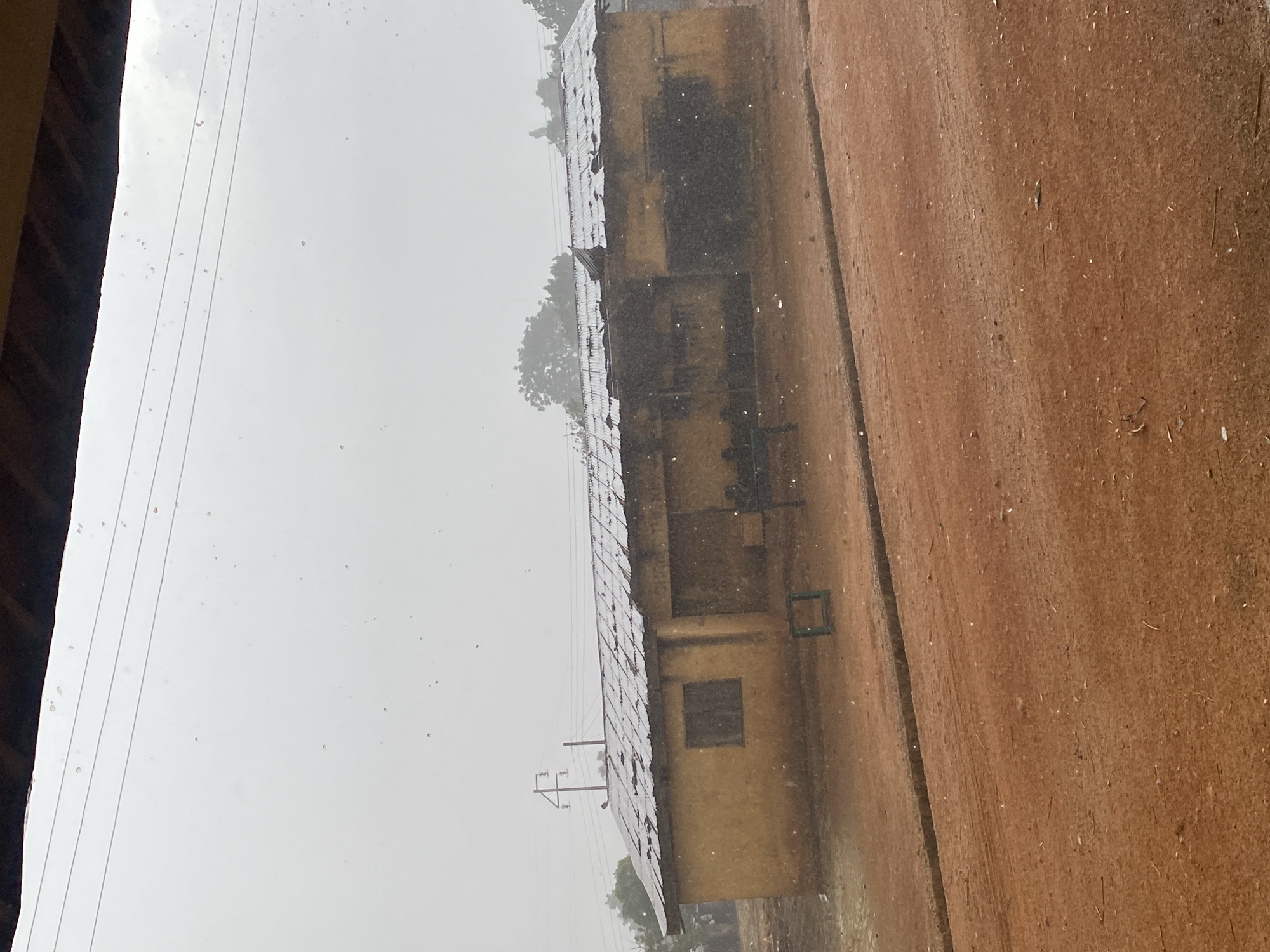 weathered, multi-story building in Kuru Dungus, Nigeria, with a corrugated metal roof. A dirt road runs along the side of the building. The sky is overcast and it appears to be raining. Power lines are visible in the background. No people are visible.