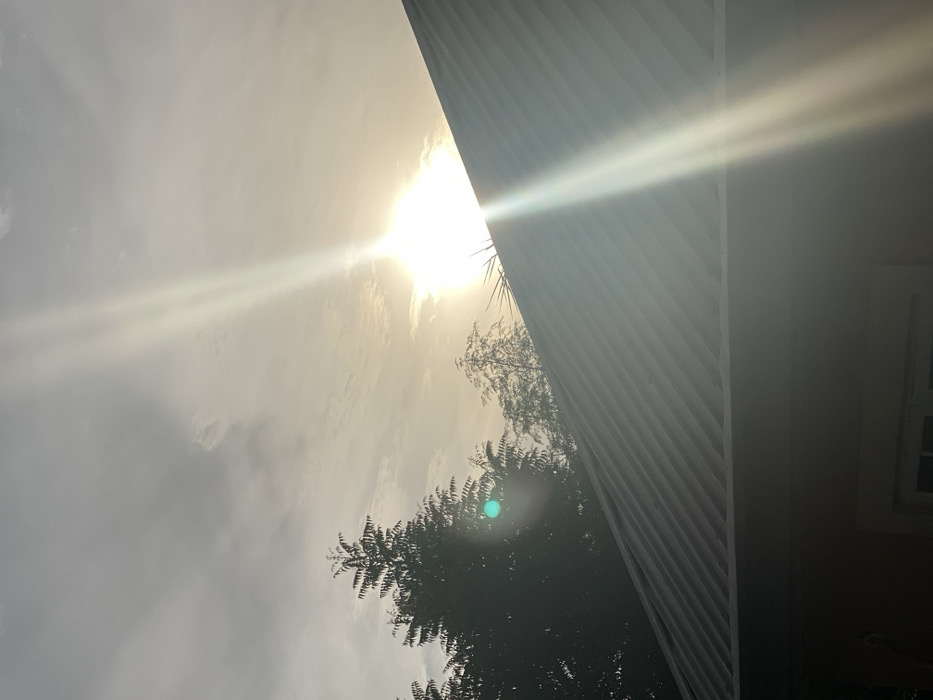 The scene is set outdoors in Zango-ndaji, Nigeria, under a bright, hazy sky with scattered light-grey clouds. The sun, a powerful and overexposed light source, is positioned in the upper right quadrant, emitting a strong vertical lens flare that extends across the image. A distinct green circular lens flare artifact is present in the mid-left area, intersecting with dark foliage. The upper left and mid-left areas contain dense, dark green foliage from trees, with distinct pinnate leaves visible on the largest tree. Lighter, sparser tree canopy is visible further right, and several spiky plant fronds are silhouetted against the sun's glare, positioned just above a visible roofline. The lower half of the image features the steeply sloped, corrugated metal roof of a building, appearing grey/silver with parallel linear ridges. Direct sunlight reflects prominently on the right side of the roof. Below the roofline, a segment of a light-colored building wall, possibly tan or pale orange, is visible, with a portion of a white-framed window or door frame apparent at the very bottom center of the frame. No individuals or discernible actions are depicted.