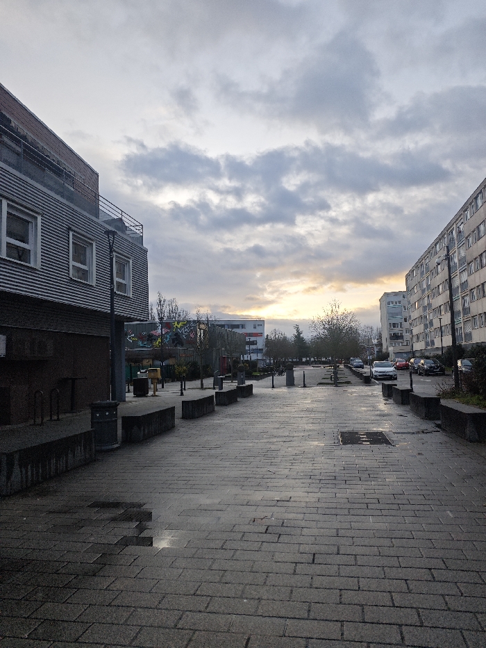 A cityscape presents a long, paved walkway lined with concrete benches and sparse trees. Buildings flank either side, one modern with corrugated metal and windows, the other a taller, multi-story apartment block. A graffiti-covered structure is visible further down the walkway. The sky is overcast with a golden light piercing through the clouds at the horizon. The pavement is wet, reflecting the ambient light. Cars are parked in the distance.