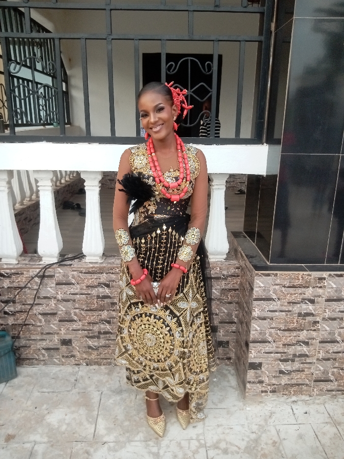 A woman stands outdoors wearing a traditional Nigerian dress. The dress is black with gold embellishments, long sheer sleeves, and a full skirt with a large circular design. She accessorizes with red coral beads around her neck, wrists, and in her hair, and wears gold heels. A black feather adorns her shoulder. Behind her are a building with a balcony and a brick wall.