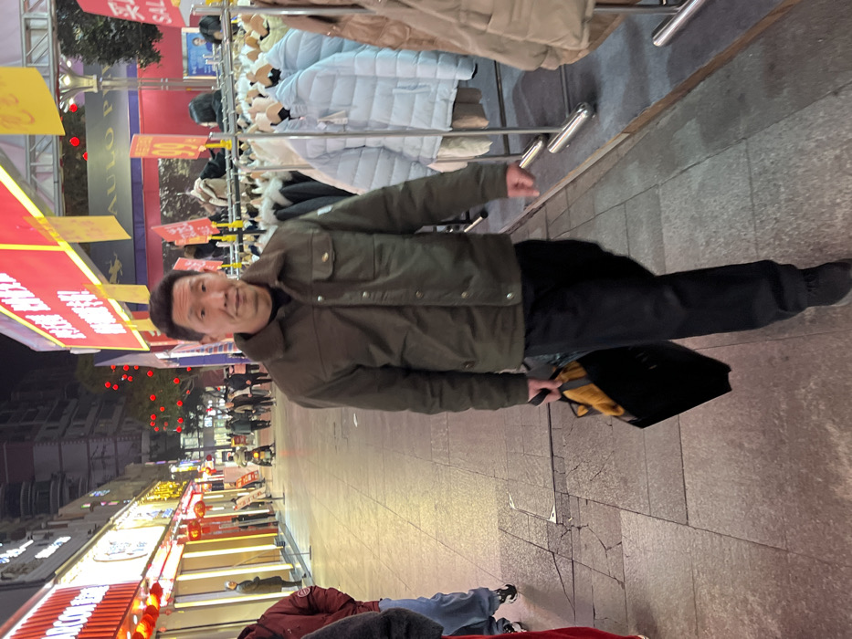 The image presents a nighttime scene in a commercial district of Jiangjin, China. In the immediate foreground, an East Asian male, appearing middle-aged, walks toward the viewer's left. He wears a dark olive-green collared jacket with snap closures and two chest pockets, a dark undershirt, black trousers, and dark shoes. He holds a black shopping bag containing a visible yellow item in his right hand. His expression is neutral, with his gaze directed towards the camera. To the subject's left, the partial figure of another individual, clad in a red jacket and blue jeans, walks away. Further along the sidewalk on the left, an individual in a light-colored coat stands near a brightly illuminated storefront adorned with red lanterns. The background shows a bustling street with multiple pedestrians and one individual on a scooter or motorcycle. To the subject's right, a metal clothing rack displays various padded jackets, including light blue, beige, and brown items. The background features multi-story buildings with brightly lit storefronts. Prominent red banners with Chinese characters and signage, including a partial "PAUL" from "PAULO PE," are visible. Red spherical lights are present on trees in the midground. The ground consists of grey flagstone paving, exhibiting some cracks. The entire scene is illuminated by artificial street and shop lighting.