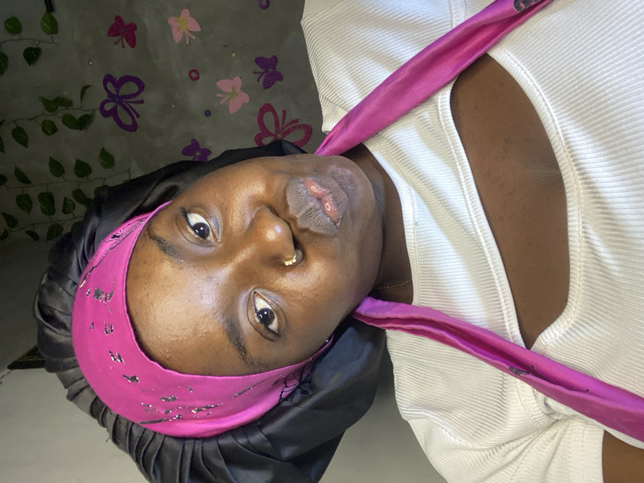 A person wearing a black satin bonnet with a pink silk scarf tied around it is visible from the chest up, tilted slightly
