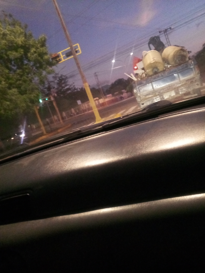 View from inside a vehicle, with a dark dashboard in the foreground. A pickup truck loaded with unidentified cargo is visible in front, waiting at a traffic light. A yellow traffic light pole is to the left, with a green light further in the distance. The sky is dusky, and power lines are visible above the truck. Trees line the left side of the road. The overall impression is of a street scene at dusk or dawn.