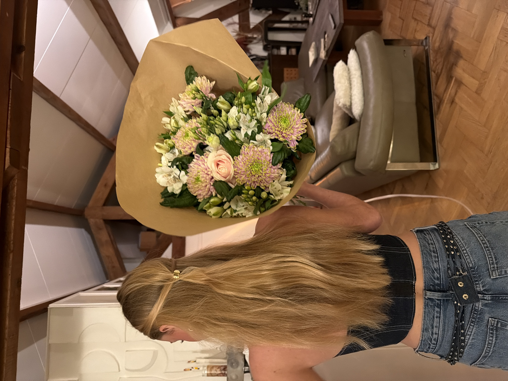 A woman is holding a bouquet of flowers wrapped in brown paper. She is wearing blue jeans with a studded belt, and a black top. The background includes a living room with a leather chair and parquet flooring. The presence of exposed wooden beams suggests an attic apartment, common in older Parisian buildings. Considering the style of architecture, furnishings, and the typical layout of residential spaces, the location could potentially be within the city of Paris, France.