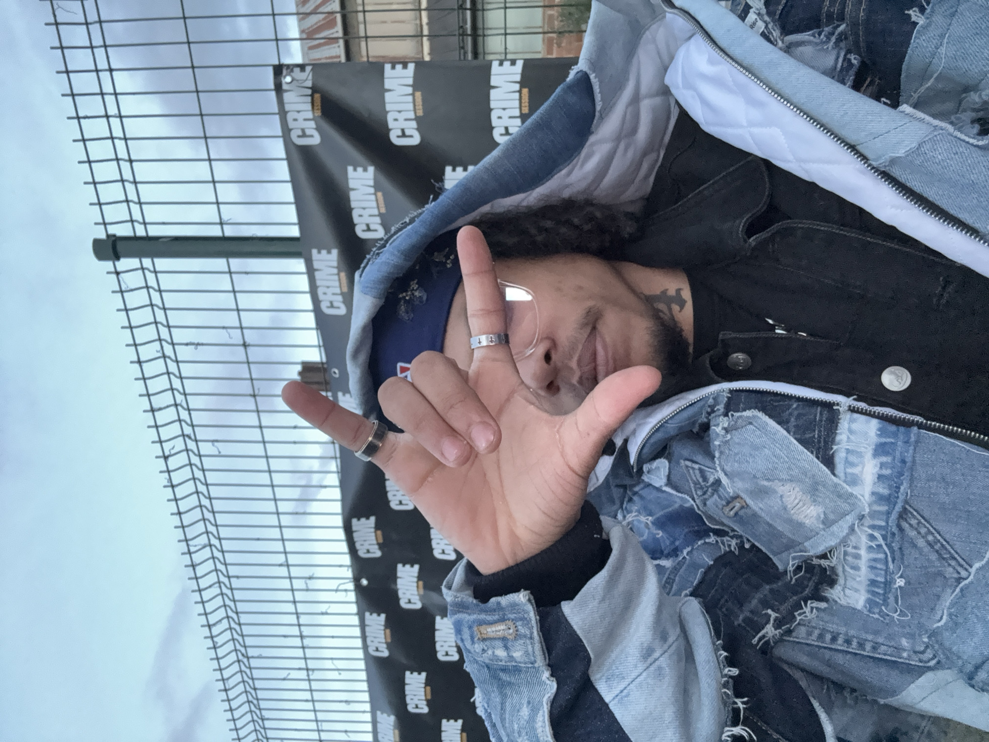 An individual is depicted in a close-up, self-portrait style photograph, situated outdoors in Noisy-le-Sec, France. The subject is a person with dark, curly hair, a dark goatee, and wearing clear-rimmed eyeglasses. They are wearing a blue bandana, a black t-shirt, a black denim jacket, and a distressed, patchwork denim hooded jacket with a white quilted lining. A black tattoo is visible on the left side of their neck. Their right hand is raised, with the thumb extended and index finger pointing upwards, forming an 'L' shape, partially obscuring their face below the eyes. Rings are present on their right index and middle fingers. In the background, a light gray metal panel fence with dark green posts is visible, running horizontally. Below the top of the fence, a black banner is strung, displaying repetitive white text that reads "CRIME" with "SESSION" underneath in smaller font. The sky above the fence is overcast and light blue. Portions of a building with reddish-brown brickwork are faintly discernible behind the banner and fence.